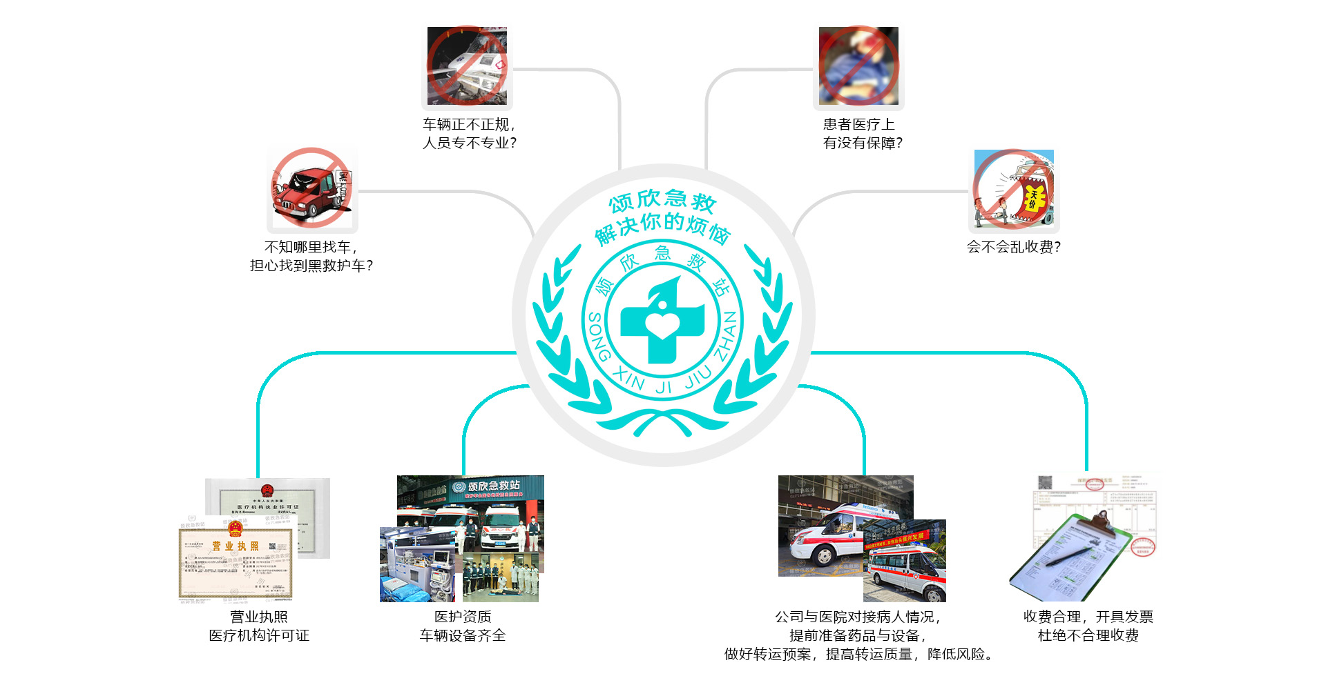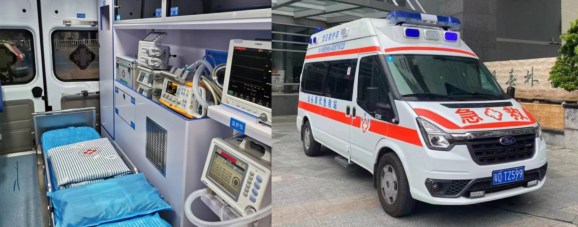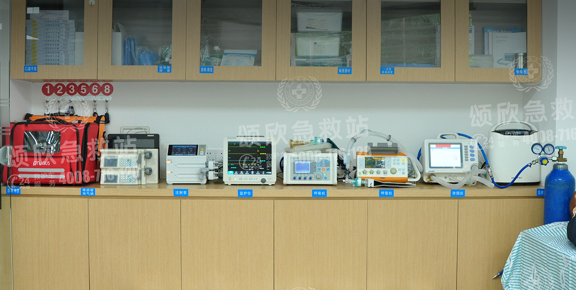 擁有:司機6名;醫護人員6名,福特救護車6臺(監護型,負壓型)。 擁有:德國進口德爾格Plus急救轉運呼吸機(無創、有創共享)等多臺高端設備。除顫儀、心電監護儀、電動吸痰機、注射泵、霧化機、氧氣瓶、自動上車擔架、急救藥箱(腎上腺素、異丙腎上腺素、西地蘭、安定、止血敏、速尿、曲馬多、甲強龍等)。